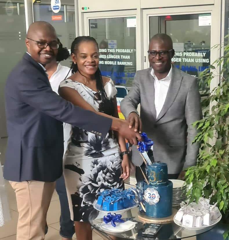 CAPTION: Stanbic Bank Chief Executive, Solomon Nyanhongo (right) is joined by Non-Executive Board Members, Mucha Mkanganwi (left and Nellie Tiyago-Jinjika (Centre) in cutting the 30th anniversary cake as the leading financial services institution celebrates 30 years of service excellence.
